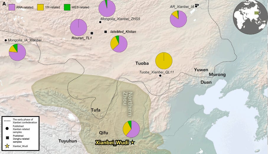 Although the lineage of the Northern Zhou dynasty in no way guarantees that the rulers of the Rouran Khaganate also carried C-F380, it does underline the importance of C-F380 in early Mongolic populations. Considering the origin of the Mugulü clan, being intrinsically tied to the steppe regions adjacent to the Gobi Desert, I think there is a really high chance C-F380 would be their patrilineal lineage.