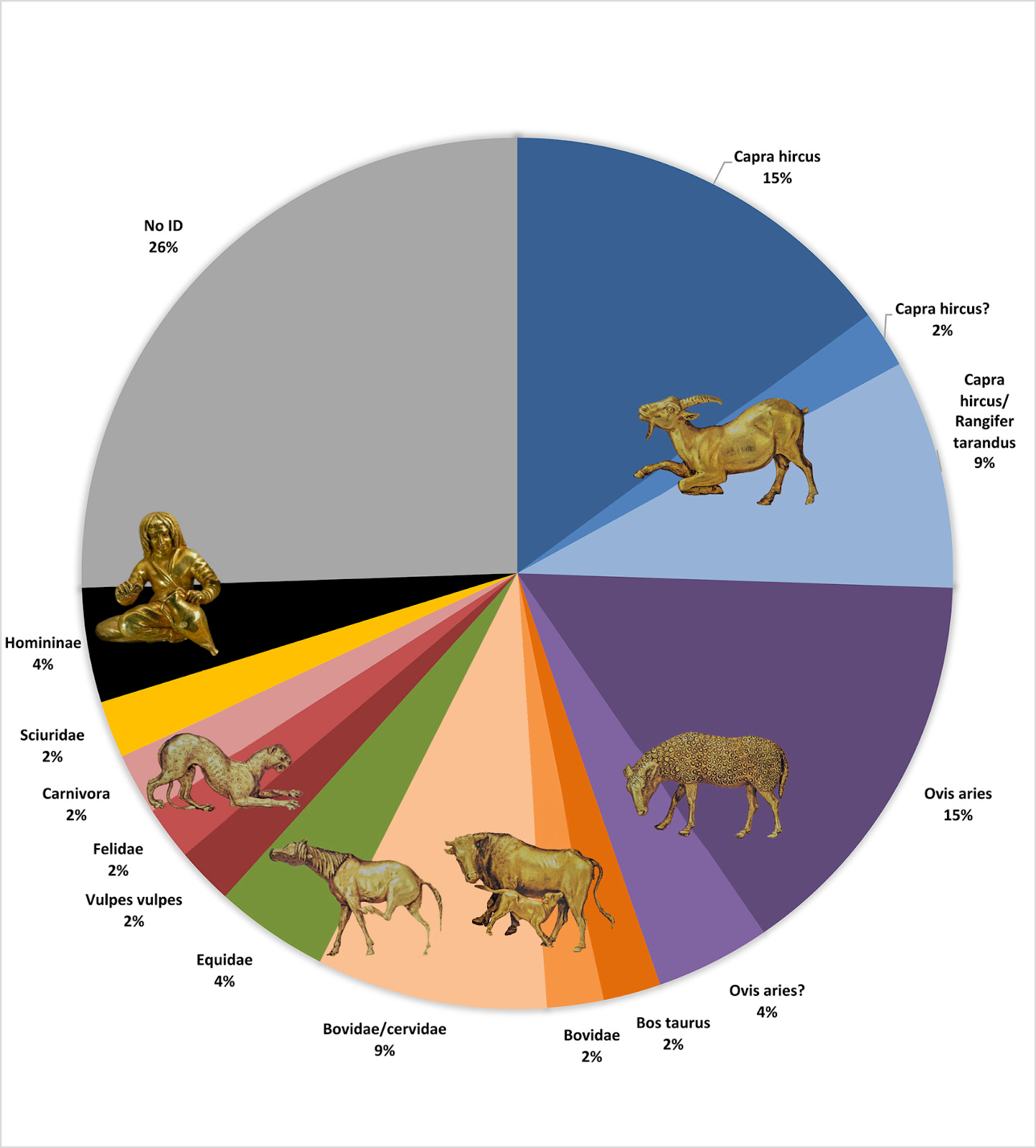 The final three ZooMS identifications stand out the most: two come from a wild carnivore (one identified as red fox (sample 45), the other could be referred to either tiger, lion, marten, wolverine, otter or hyena (sample 34).