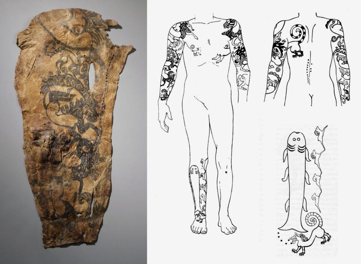 Combining the burial, stature and tattoos, it is clear this male belonged to the upper strata of the Pazyryk society. Given the various unhealed injuries on his body he likely met his end on the battlefield.